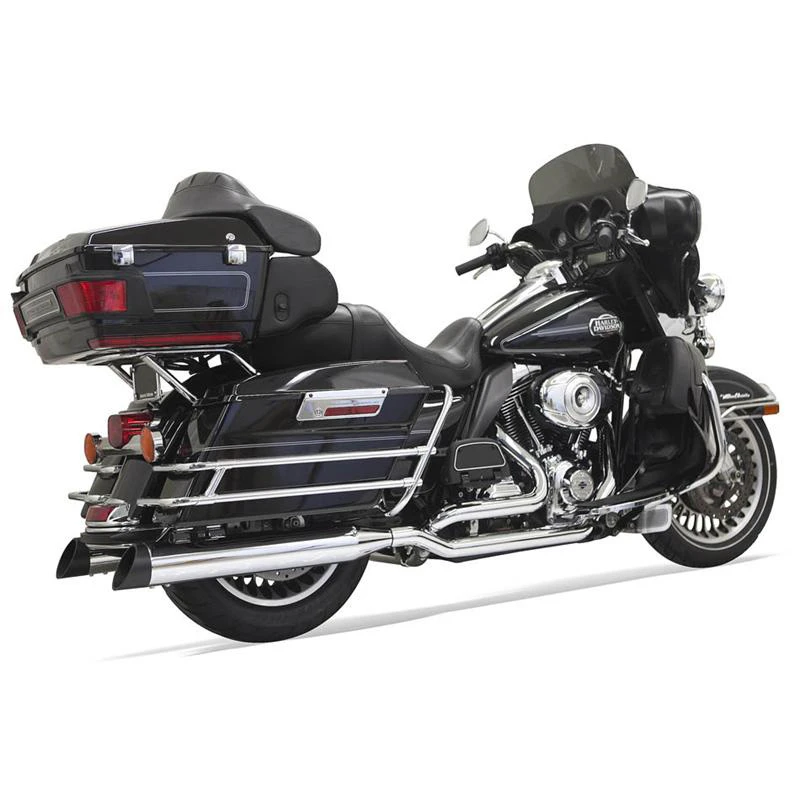 SLIP-ON Mufflers for Road King®, Road Glide®, Dresser and Twin Cam 88® models and later. Slip-on mufflers for touring models are available in five styles; slash cut, straight cut, slice cut, slant cut, megaphone and a 4″ straight can. Mufflers feature 4″ diameter 16 guage steel construction with tunable and replaceable flow-through baffles. Mufflers are finished in a show-quality chrome finish.