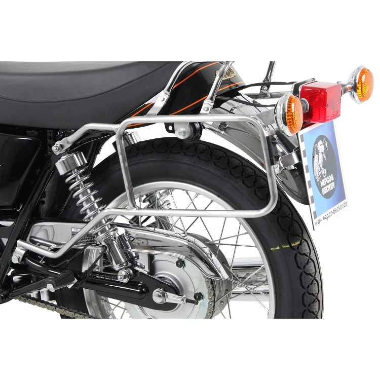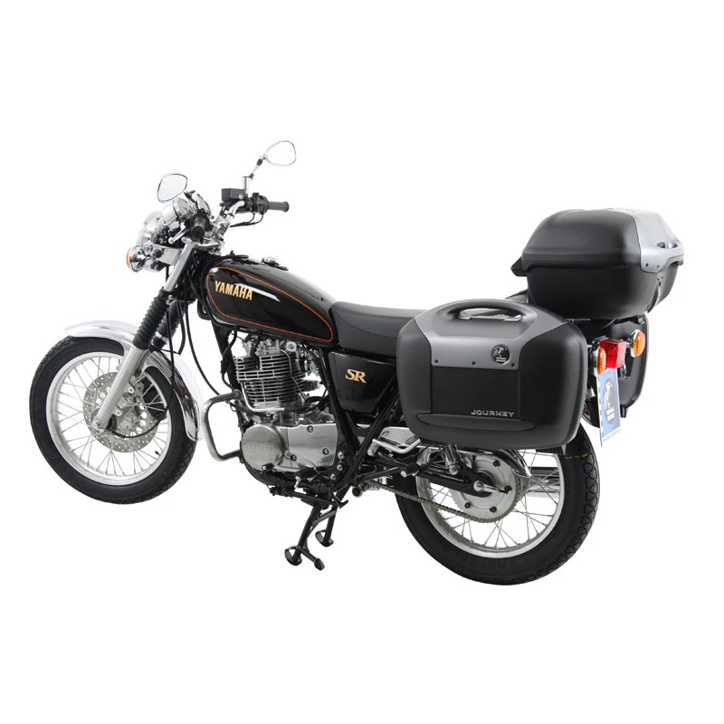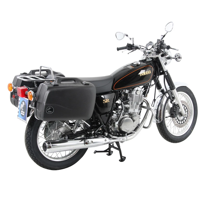 Hepco & Becker’s 650.4541 00 02 Complete Rack is made specifically for Yamaha SR400. This Rack accepts any hard side case or top case from Hepco & Becker. The design of the complete rack gets its overall strength from being installed as a unit to the strong points of the bike’s frame. For this reason, it cannot be separated to use individually as a rear or side rack. Every Complete Rack is custom designed for each individual model of bike and will only work on the model it is specified for. These racks are made of high quality steel tubing finished in black, silver or chrome. All racks are relatively easy to install and come with the required hardware and installation instructions.