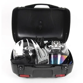 The new Junior 55 top case. The classic design from Hepco & Becker has been updated to modern styling. This case remains one of the toughest and yet elegant available today. Virtually unbreakable featuring a double walled shell made of highly impact resistant material absorbs impacts and falls. Thanks to a special seal, the bags are watertight allowing for the most grueling conditions. Available in 3 different styles being solid black, gloss black, and silver. The largest Hepco & Becker case available providing 55 liters of room and enough space for two full sized helmets. The top case can also be fitted with additional items such as a top case railing for additional storage as well as a backrest and inner bag.