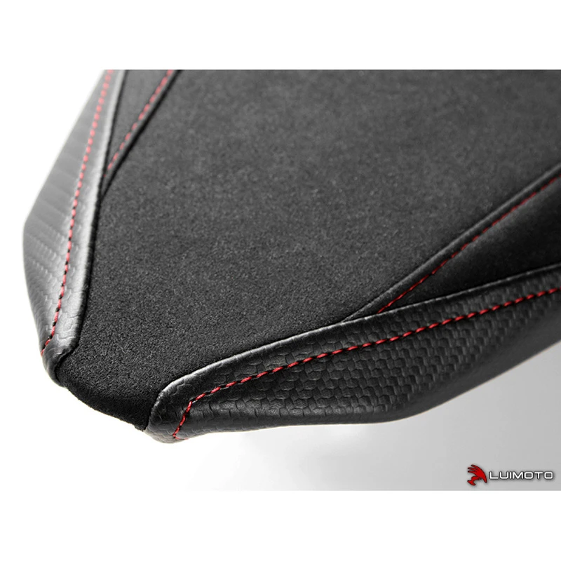 Introducing the Corsa passenger seat cover for your Ducati Panigale V4! Featuring a synthetic suede riding surface, carbon fiber marine-grad vinyl stitched with contrast stitching. This is the ultimate expression of Luimoto.