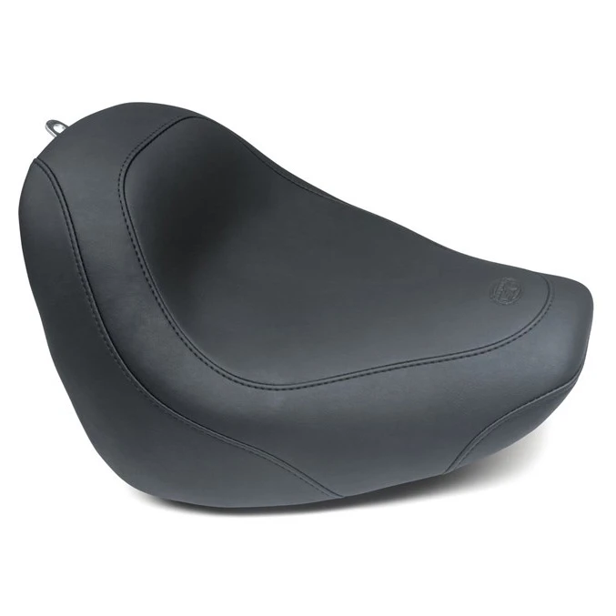 The edges of all baseplates have a steel reinforced, impact absorbing vinyl edge trim to protect the seat cover. Polyurethane bumpers are strategically located and riveted to the baseplate to prevent it from touching the frame and fender and to minimize vibration. Mustang’s unique internal support wings are added to the baseplate to provide maximum driver and passenger comfort. These wings support the entire width of the molded foam. This feature is found on most Mustang touring seats. Bumpers will not crack with age and are ozone protected. Solos with built-in driver backrests have the receiver welded and reinforced to the baseplate for strength. Foam surrounds the hardware to provide maximum comfort.