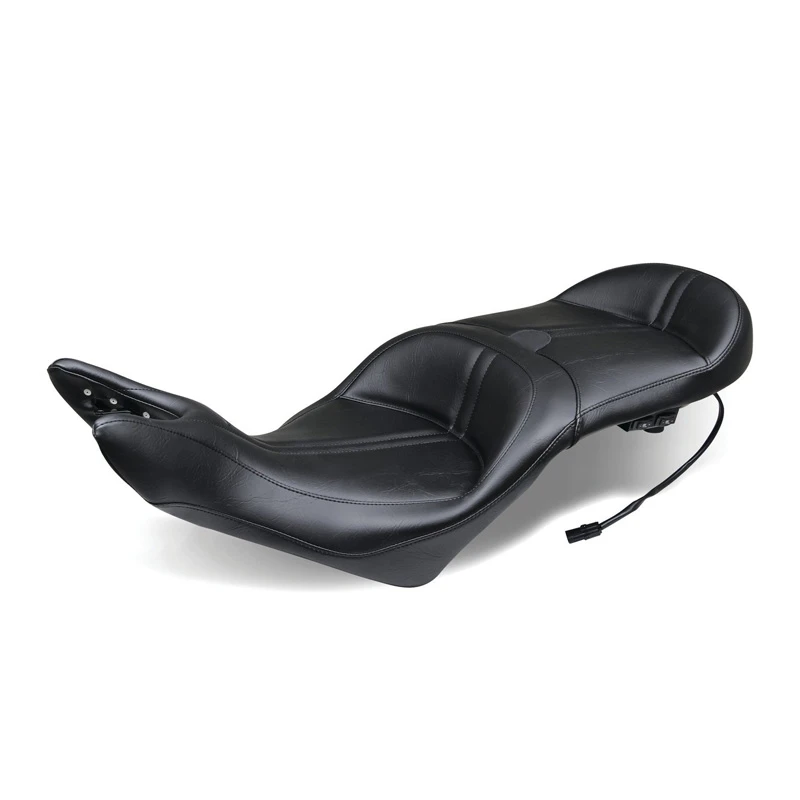 All baseplates for these seats are made of marine-grade, 3/16″ thick fiberglass, finished in high gloss gel coat. All brackets are riveted in place. Exposed brackets are bright chrome plated. Polyurethane rubber bumpers are strategically located and riveted to the baseplate to prevent it from touching the frame and fender and to minimize vibration. Bumpers will not crack with age and are ozone protected. The hidden brackets have a tough, black epoxy powder coat finish and the edges of all baseplates have a steel reinforced, impact absorbing vinyl edge trim to protect the seat cover Mustang’s unique internal support wings are added to the baseplate to provide maximum driver and passenger comfort. These wings support the entire width of the molded foam. This feature is found on most Mustang touring seats. - Baseplates for Mustang Seats for Harley-Davidson®