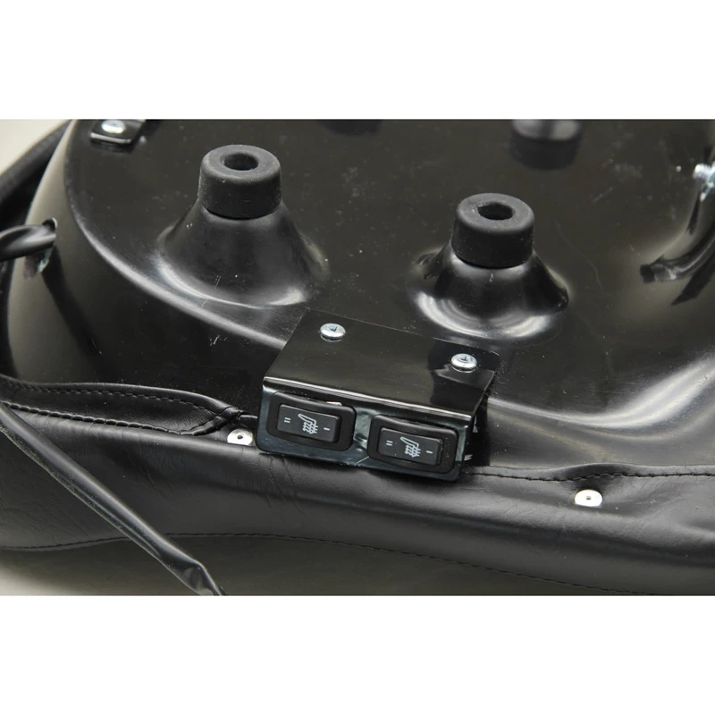 The edges of all baseplates have a steel reinforced, impact absorbing vinyl edge trim to protect the seat cover. Polyurethane bumpers are strategically located and riveted to the baseplate to prevent it from touching the frame and fender and to minimize vibration. Mustang’s unique internal support wings are added to the baseplate to provide maximum driver and passenger comfort. These wings support the entire width of the molded foam. This feature is found on most Mustang touring seats. Bumpers will not crack with age and are ozone protected. Solos with built-in driver backrests have the receiver welded and reinforced to the baseplate for strength. Foam surrounds the hardware to provide maximum comfort.