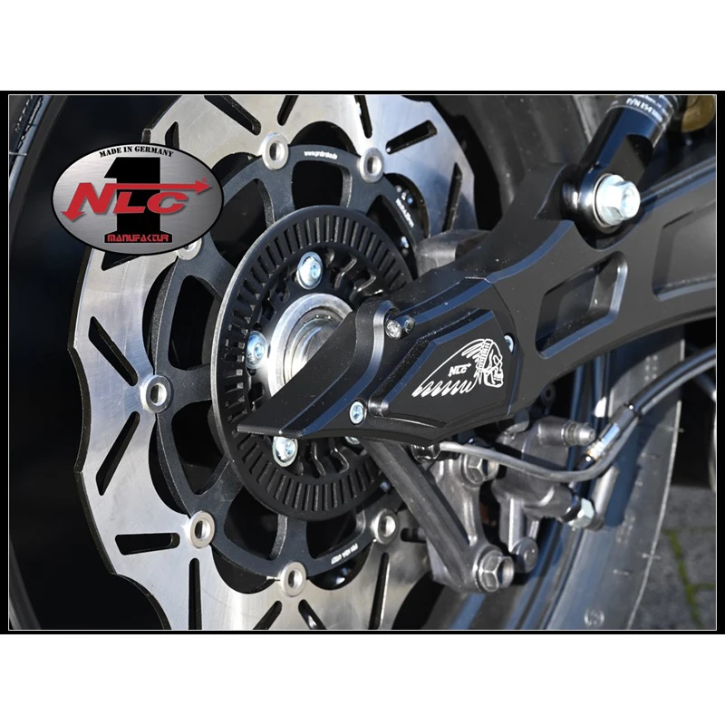 Black CNC Aluminum swing arm with cut outs and inserts that can be painted if you want to have some color contrast. Highest quality german made construction. The original swing arm is too narrow to accommodate over size wheels and tires. This Indian Scout swing arm will accept large wheels with 240 mm tires. Compatible with original Indian Scout stock size rear wheel and brake system, caliper mount bracket sold separately. This swing arm will accept the original brake system when combine with our OEM caliper mounting bracket SKU or drive side brake system SKU NLC-. Not compatible with the original exhaust bracket which will have to be modified. We suggest to replace the complete exhaust system with a short exhaust like our SKU NLC-IS-5400. Our belt guard part number NLC-IS-6000 and 10 mm offset pulley are required and sold separately. Includes swing arm, swing arm axle, wheel axle, front and rear axle covers, brake line and wheel spacers.