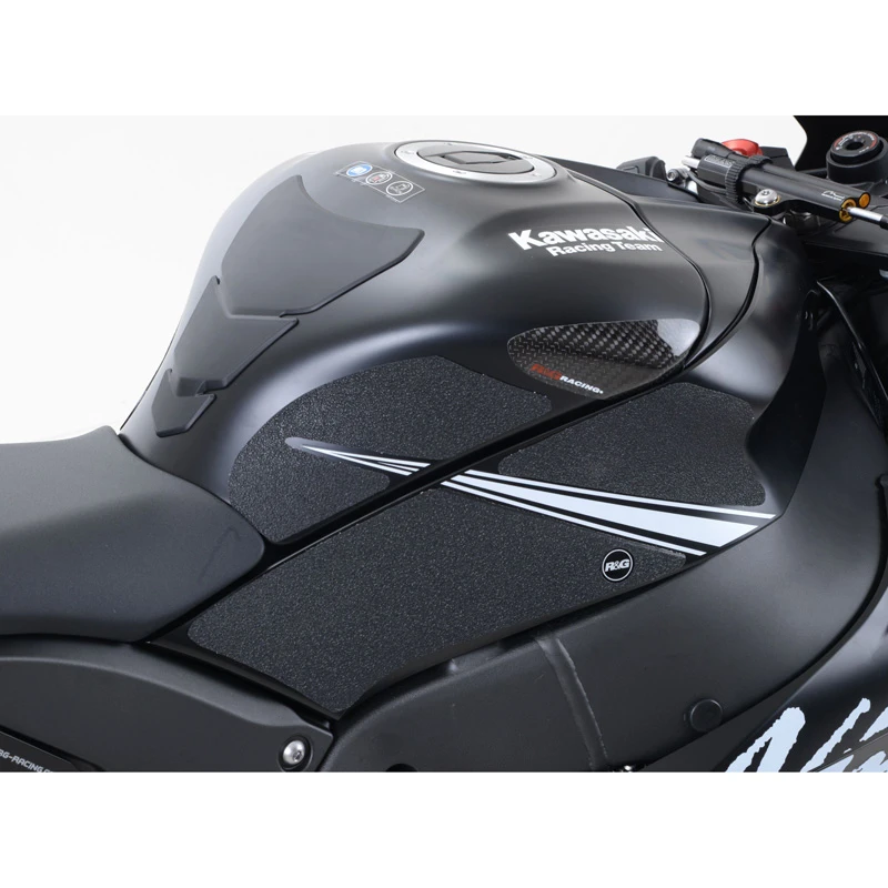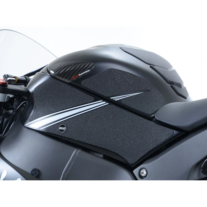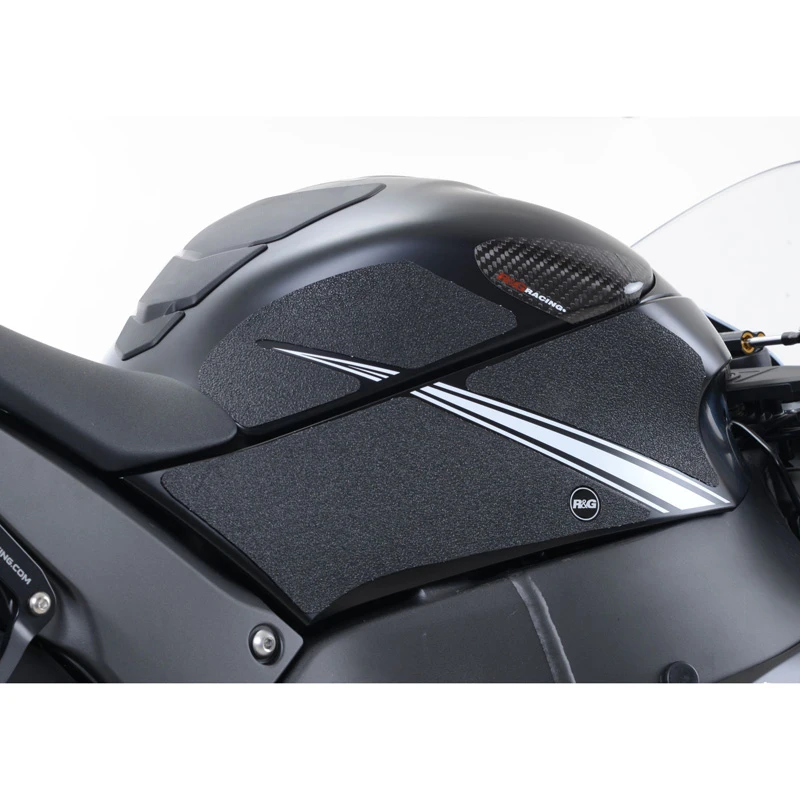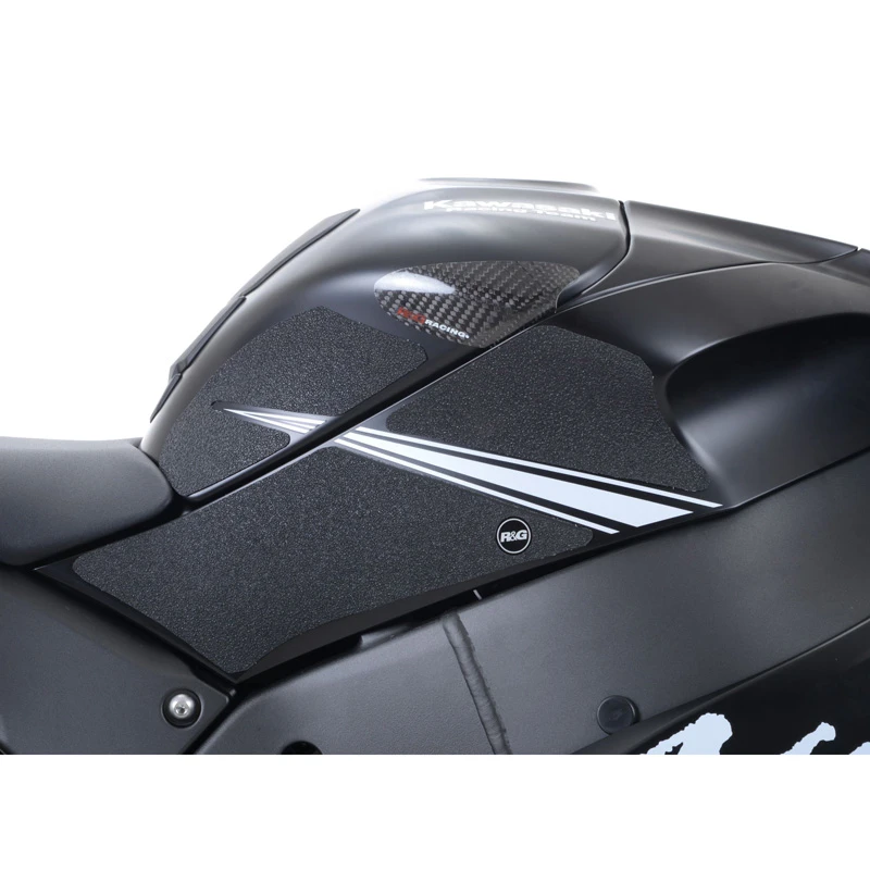 The R&G tank traction grips maximize the potential of the Kawasaki ZX-10R Ninja 2016 by enhancing control and communication with the motorcycle. Low profile synthetic rubber pads adhere to the bike and prevent slipping on the glossy finish during riding. Acceleration, braking and handling are improved as the rider is able to maintain body position with these handy traction grips and focus on the road ahead. Comfortably and confidently hang off the bike throughout each knee dragging corner. Fatigue is significantly reduced without the need to constantly re-adjust and combat slipping on the tank. Proper posture is also easier to achieve ultimately prolonging comfort. These versatile grips also preserve the bodywork as the finish can easily become dull and scratched from everyday use without them. Black or clear colors are available